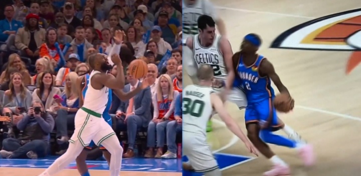 比赛中,SGA在一次合球挂手臂造成犯规后,杰伦·布朗当即对裁判表示:“这不是篮球。”